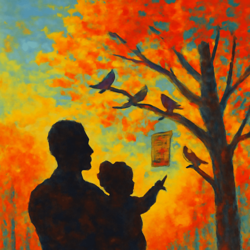 The cover is me holding her, pointing at birds in a tree. We’re just shadows, no details. Because it’s not about how we look. It’s about the moment.